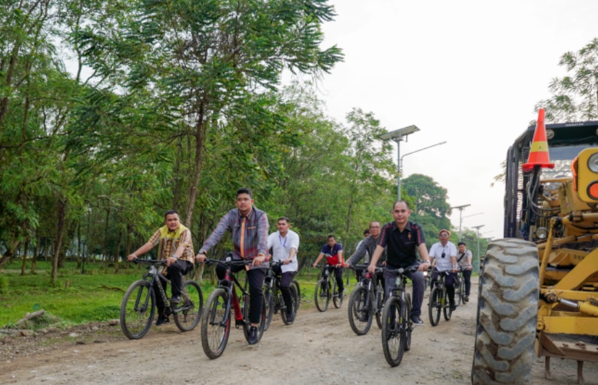 Medan, Transnusantara– Dengan mengendarai sepeda, Wali Kota Medan Bobby Nasution meninjau revitalisasi Taman Cadika Jalan Karya Wisata Medan, Jumat (12/7) Petang. Peninjauan ini dilakukan guna melihat sejauh mana progres revitalisasi yang dilakukan.