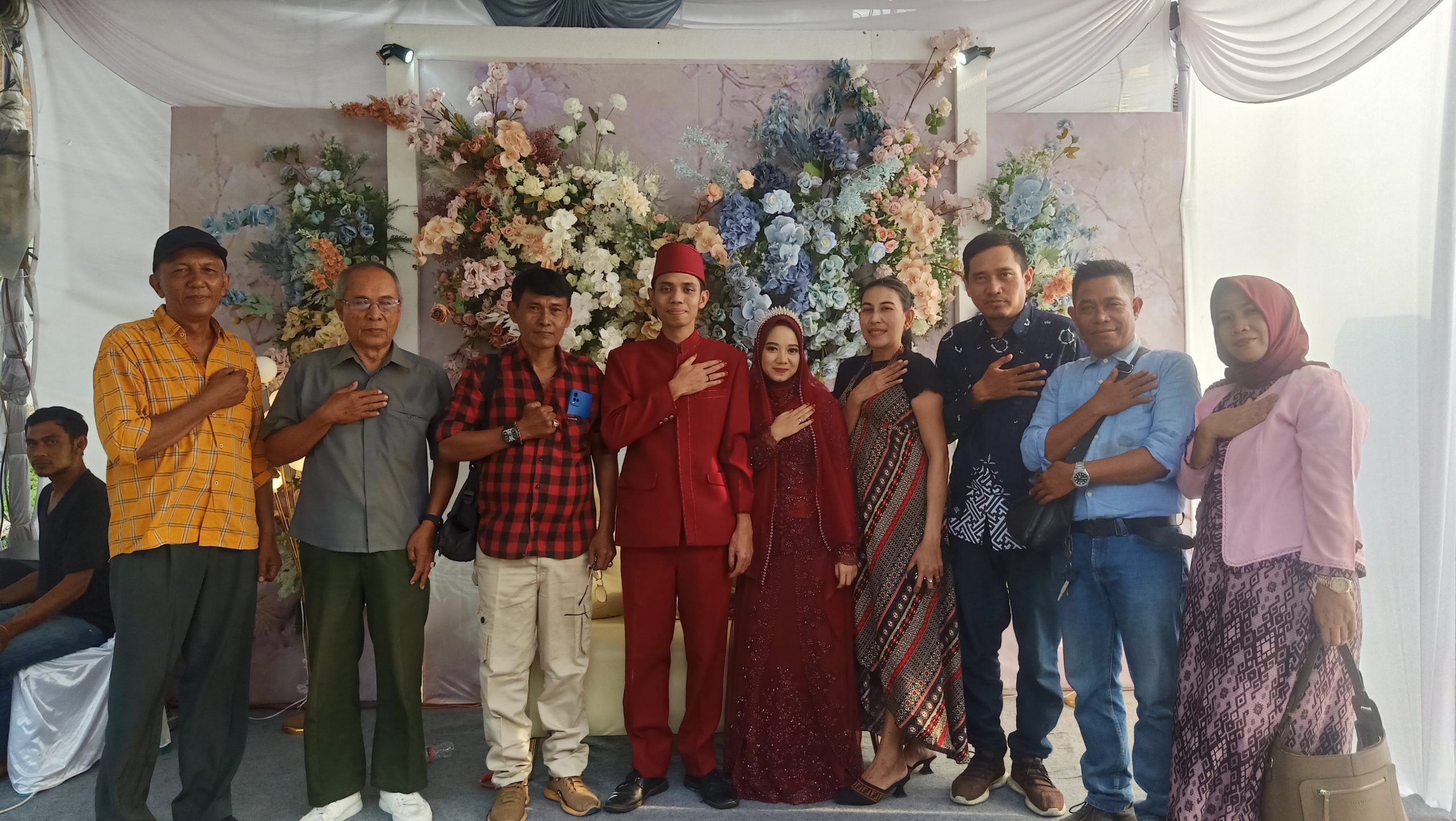 Sekjen FJP, S.Purba berkesempatan swafoto bersama dengan kedua mempelai dan sejumlah wartawan di tengah acara resepsi.