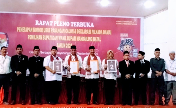Rapat Pleno Terbuka yang dipimpin oleh Ketua KPU Kabupaten Mandailing Natal Muhammad Ikhsan, Pasangan Calon Bupati dan Wakil Bupati Mandailing Natal Harun Mustafa Nasution dan H. Muhammad Ichwan Husein Nst, S.H mendapatkan Nomor Urut 1 (Satu), sementara Pasangan Calon Bupati dan Wakil Bupati Mandailing Natal H. Saipullah Nasution S.H, M.M dan Atika Azmi Utammi mendapatkan Nomor Urut 2 (Dua).
