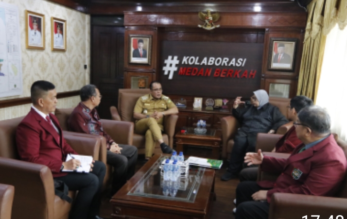 Medan, Transnusantara-                  Pelaksana tugas (Plt) Wali Kota Medan H Aulia Rachman SE menerima kunjungan Rektor Universitas Islam Sumatera Utara (UISU) di ruang kerjanya di Balai Kota Medan, Senin (30/9/2024). Dalam pertemuan tersebut, dibahas terkait kolaborasi antara Pemko Medan dengan UISU untuk mencetak SDM berkualitas.