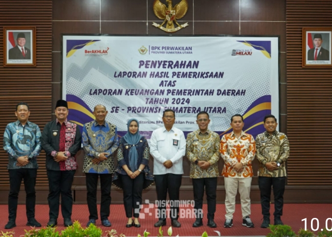 Batu Bara, Trans Nusantara -Bupati Batu Bara H.Baharuddin Siagian,SH, M.Si menerima laporan keuangan Pemerintah daerah (LKPD) Pemerintah Kabupaten Batu Bara T.A. 2024, dari Badan Pemeriksa keuangan (BPK) RI perwakilan Sumut di kantor BPK RI Perwakilan Sumut Jalan Imam Bonjol, Senin,( 26/05/2025 ).