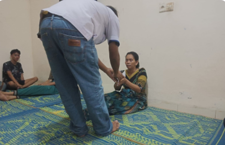 Foto : Ketua DPD SPRI Sumatera Utara Burju Simatupang, SH memberikan uang sumbangan kepada istri almarhum, di rumah duka, Selasa ( 22/7/2025 )