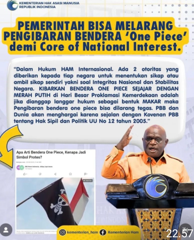 Jakarta – Transnusantara.co.id – Menteri Hak Asasi Manusia (HAM) Natalius Pigai menyoroti fenomena pengibaran bendera fiksi “One Piece” yang sejajar dengan bendera Merah Putih pada momen peringatan Proklamasi Kemerdekaan Republik Indonesia Tahun 2025.