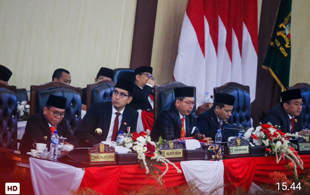 Medan, Trans Nusantara -Wali Kota Medan Rico Tri Putra Bayu Waas bersama Wakil Wali Kota Medan H Zakiyuddin Harahap menghadiri Rapat Paripurna DPRD Kota Medan dengan agenda Mendengarkan Pidato Kenegaraan Presiden Republik Indonesia (RI) dalam rangka HUT ke- 80 Kemerdekaan RI di Gedung DPRD Medan, Jumat (15/8/25). Agenda Paripurna ini juga menyaksikan dan mendengarkan secara live Sidang Tahunan MPR RI dan Sidang Bersama DPR RI dan DPD RI Tahun 2025 sekaligus Pidato Presiden Republik Indonesia Prabowo Subianto tentang Penyampaian Laporan Kinerja Lembaga-Lembaga Negara.