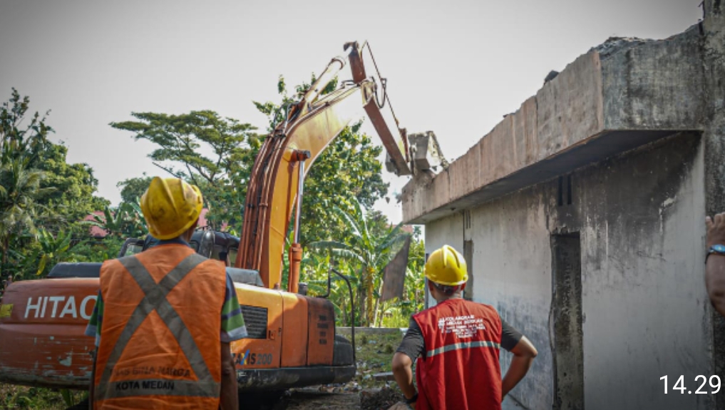 Tiga unit alat berat milik Dinas Sumber Daya Air, Bina Marga, dan Bina Konstruksi (SDABMBK) Kota Medan—satu backhoe loader standar dan dua backhoe loader mini—diturunkan untuk meratakan kedua bangunan tersebut.