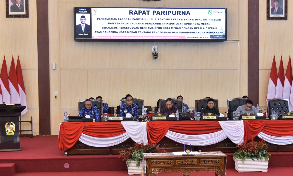 MEDAN, TransNusantara.co.id – DPRD Kota Medan menggelar rapat paripurna dengan agenda pengambilan keputusan dan persetujuan bersama atas Rancangan Peraturan Daerah (Ranperda) Kota Medan tentang Pencegahan dan Penanggulangan Kebakaran, di Gedung DPRD Kota Medan Senin, ( 17/11/2025 ).