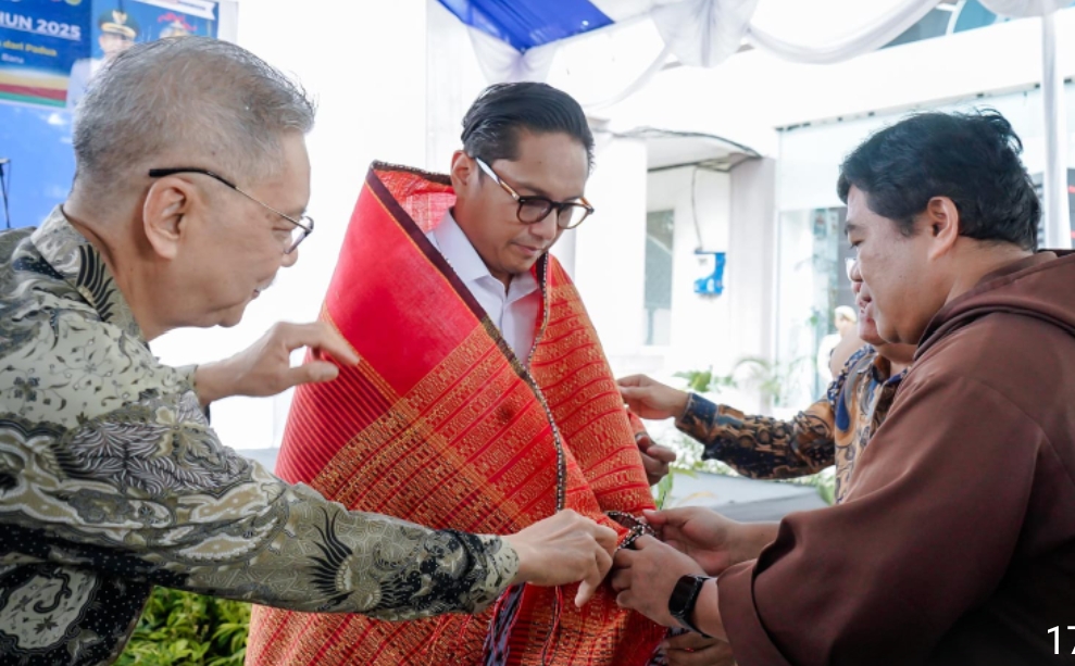Medan, Transnusantara–Safari Natal Pemko Medan di Gereja Katolik Paroki Santo Antonius Dari Padua, Minggu (7/12/2025), berlangsung hangat. Kedatangan Wali Kota Medan Rico Tri Putra Bayu Waas disambut suka cita oleh pengurus gereja yang mengalungkan rangkaian bunga serta menyelempangkan ulos sebagai simbol kasih dan doa kesehatan.