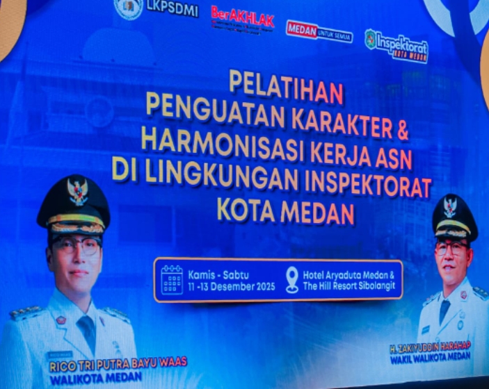 Medan, Transnusantara– Wali Kota Medan, Rico Tri Putra Bayu Waas secara resmi membuka Pelatihan Penguatan Karakter & Harmonisasi Kerja ASN di Lingkungan Inspektorat Kota Medan, di Hotel Arya Duta, Kamis (11/12/2025).