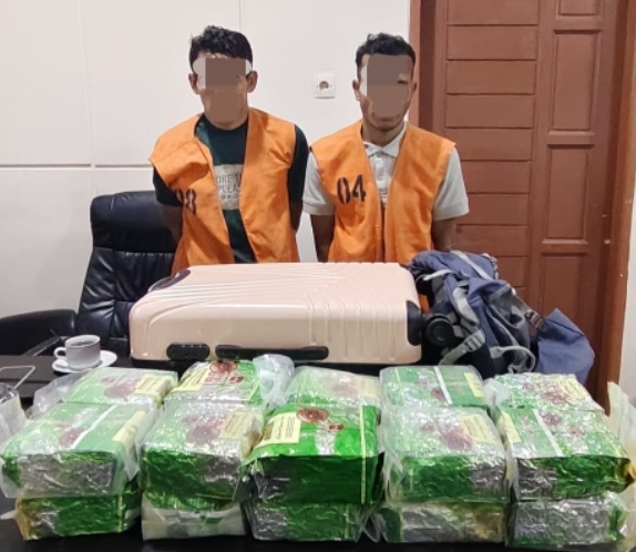 Sepuluh bungkus ditemukan di dalam tas gunung berwarna biru dan sepuluh bungkus lainnya di dalam koper pakaian berwarna pink. Total berat bruto keseluruhan mencapai ±21.142 gram.
