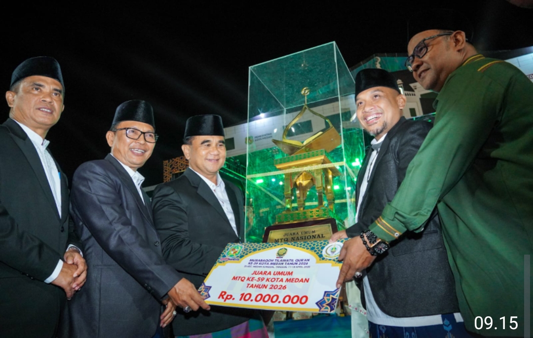 Piala bergilir MTQ Kota Medan diserahkan Wali Kota Medan, Rico Tri Putra Bayu Waas diwakili Asisten Pemerintahan dan Kesejahteraan Rakyat Setda Kota Medan, M. Sofyan kepada Camat Medan Selayang, Muhammad Husnul Hafis sekaligus menjadi penanda berakhirnya perhelatan MTQ ke-59 tingkat Kota Medan yang telah berlangsung dari tanggal 11-18 April 2026 di Jalan Gatot Subroto, Sabtu (18/4/2026) malam.